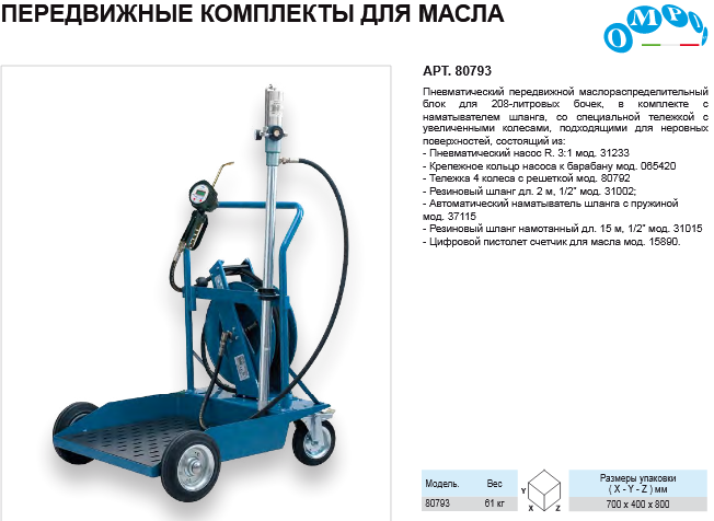 Тележка со специальными колесами для неровного пола, с решеткой для стекания, предусмотрена для установки катушки 15 м и насоса для масла или смазки. Держит вес до 400 кг.